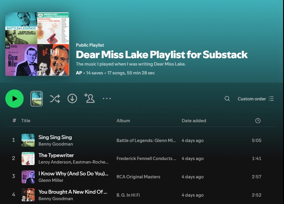 If you’ve read Dear Miss Lake or are in a reading group and planning to discuss it, I thought I’d share a post with some Extras. First off - a playlist, and then an excellent reading group guide that has been put together by the team at Scribner, my publishers in the USA.